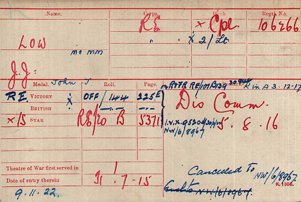 1. Medal Index Card: 2nd Lieutenant J.J. Low, R.E.