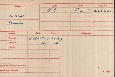 3. Medal Index Card of 220240 Pioneer David Low, R.E.